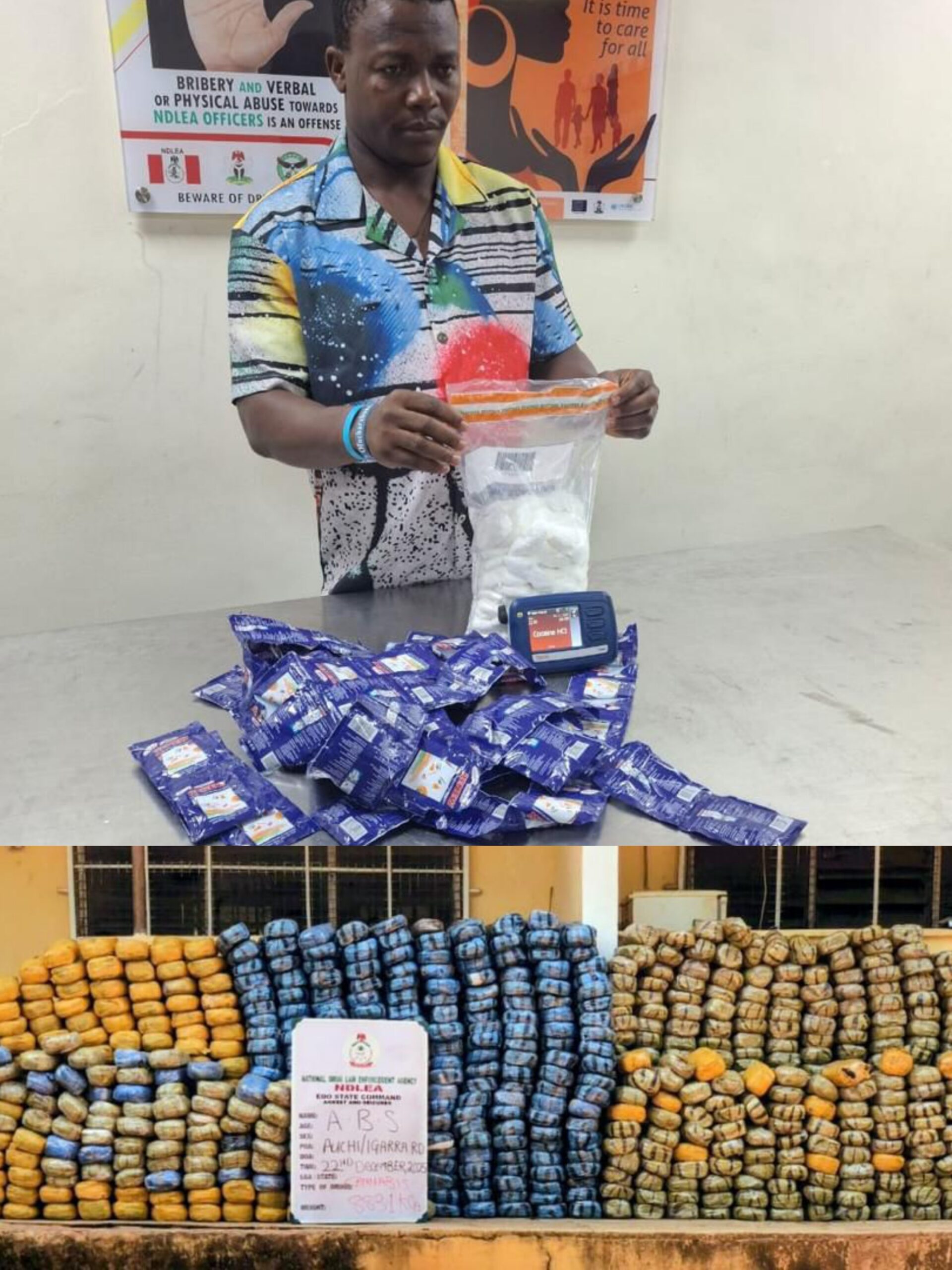 The National Drug Law Enforcement Agency (NDLEA) has arrested a notorious ex-convict, Nwobodo Chidiebere Basil, alongside three cargo agents, over an attempt to export cocaine to the United Kingdom concealed in factory-sealed sachets of cold-water starch. The seizure was made at the export shed of the Murtala Muhammed International Airport (MMIA), Ikeja, Lagos, where NDLEA operatives intercepted 75 parcels of cocaine weighing 1.50 kilograms. The suspects initially arrested on Saturday, December 20, 2025, were identified as Jubrin Firdausi Hassana, Kuku Daniel Oluwasegun and Igwe Chioma Jane. Further investigations uncovered 37-year-old…