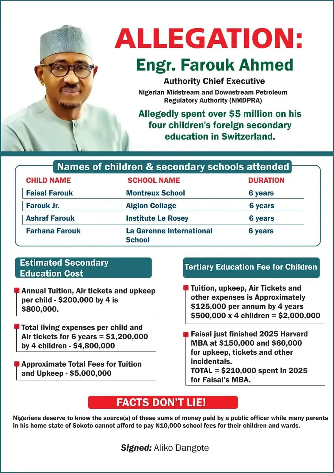 The recent allegation involving Engr. Farouk Ahmed, Chief Executive of the Nigerian Midstream and Downstream Petroleum Regulatory Authority(NMDPRA), has triggered widespread debate after Alhaji Aliko Dangote publicly questioned the source of funds allegedly used to educate four children in Switzerland at a reported cost of about $5 million. The controversy is not merely personal. It goes to the heart of public accountability in a country struggling to restore trust in its institutions.