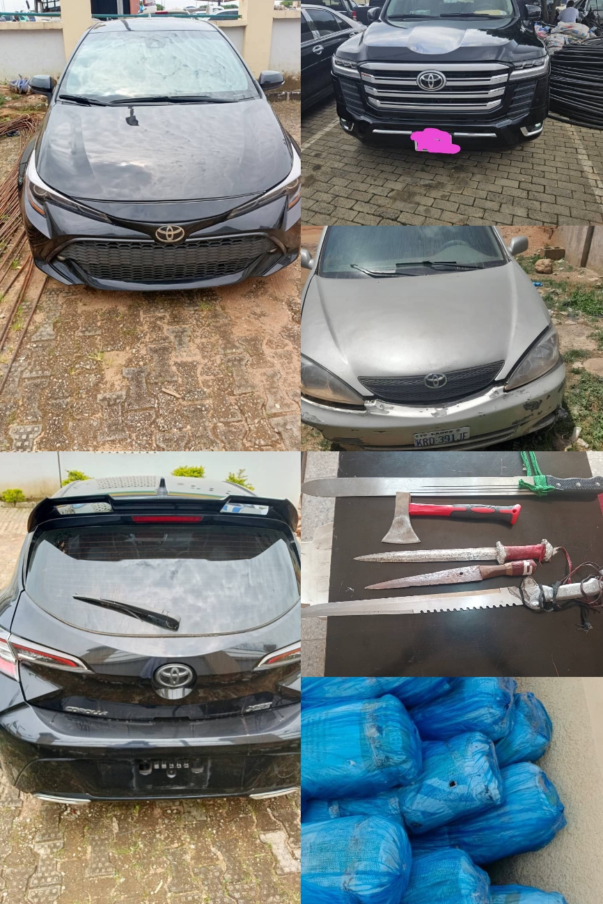 Items recovered from the suspects include a Toyota Land Cruiser stolen during an armed robbery, a black Toyota Corolla (2019 model) with chassis number JTNK4RBE1K3054902, a Toyota Camry with registration number KRD 391 JF, and assorted weapons such as a cutlass, sword, and jackknife.