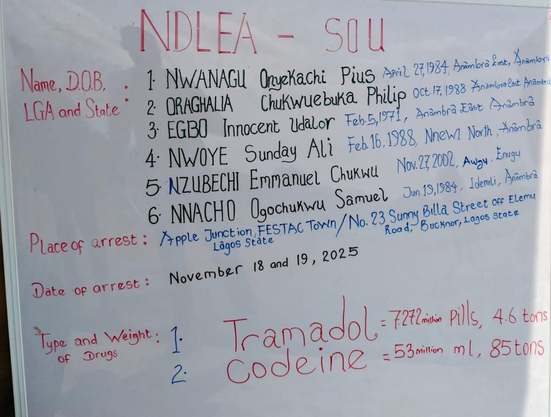 A Special Operations Unit of the NDLEA executed a two-stage operation between Wednesday, November 19, and Thursday, November 20, 2025. Two syndicate members, Egbo Innocent Udalor and Chukwe Emmanuel, were first apprehended while transporting 300 cartons of opioids at Apple Junction, Festac. The following day, officers raided the warehouse, arresting Nwanagu and other key members: Nwoye Sunday Ali, Nnacho Ogochukwu, and Oraghalia Chukwuebuka Philip.