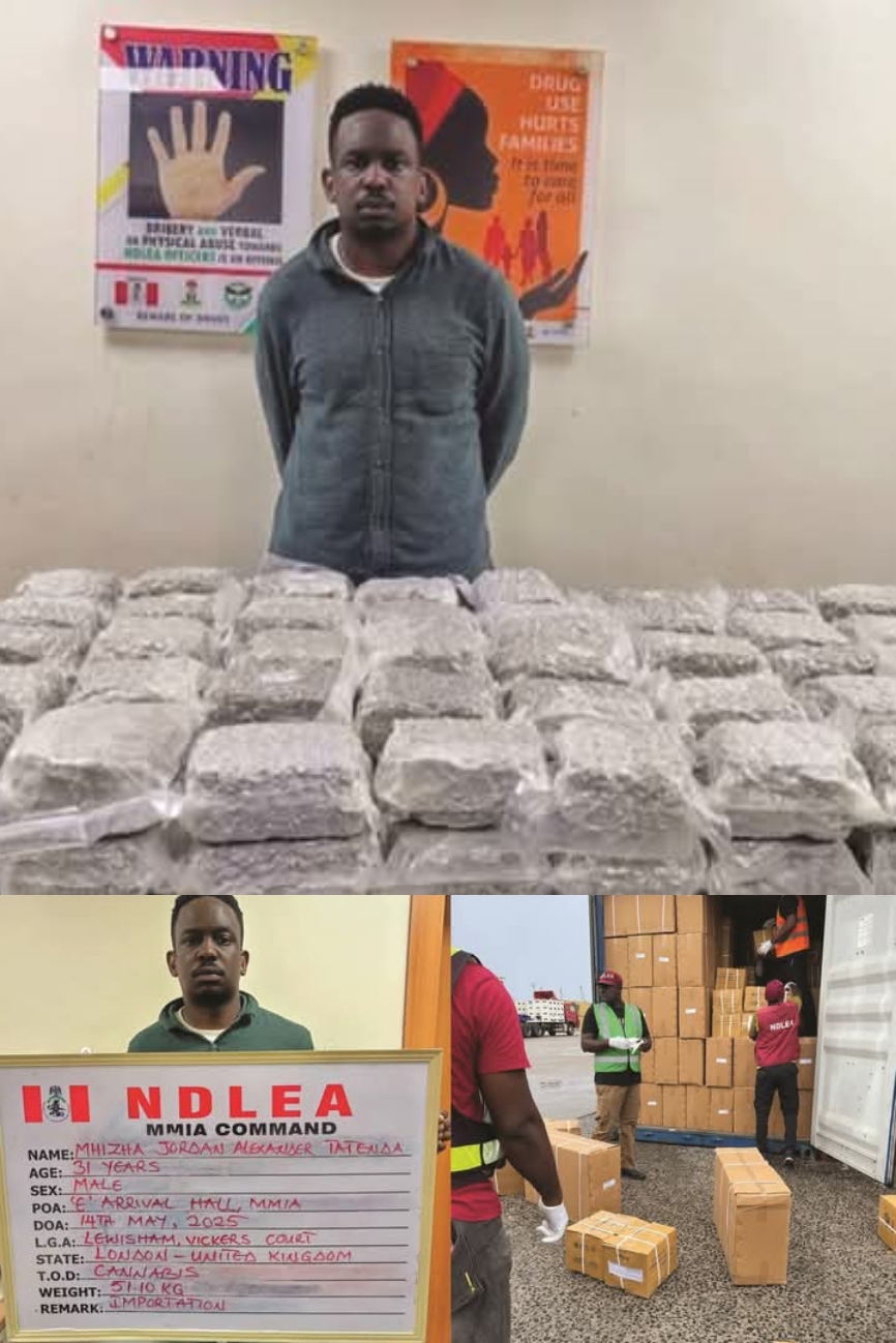 The National Drug Law Enforcement Agency (NDLEA) has arrested two British nationals, Mhizha Jordan Alexander Tatendra and Ayedipe Andrew Adejuwon, for attempting to smuggle into Nigeria 92 jumbo bags of Loud, a potent strain of cannabis, weighing 51.10 kilograms.