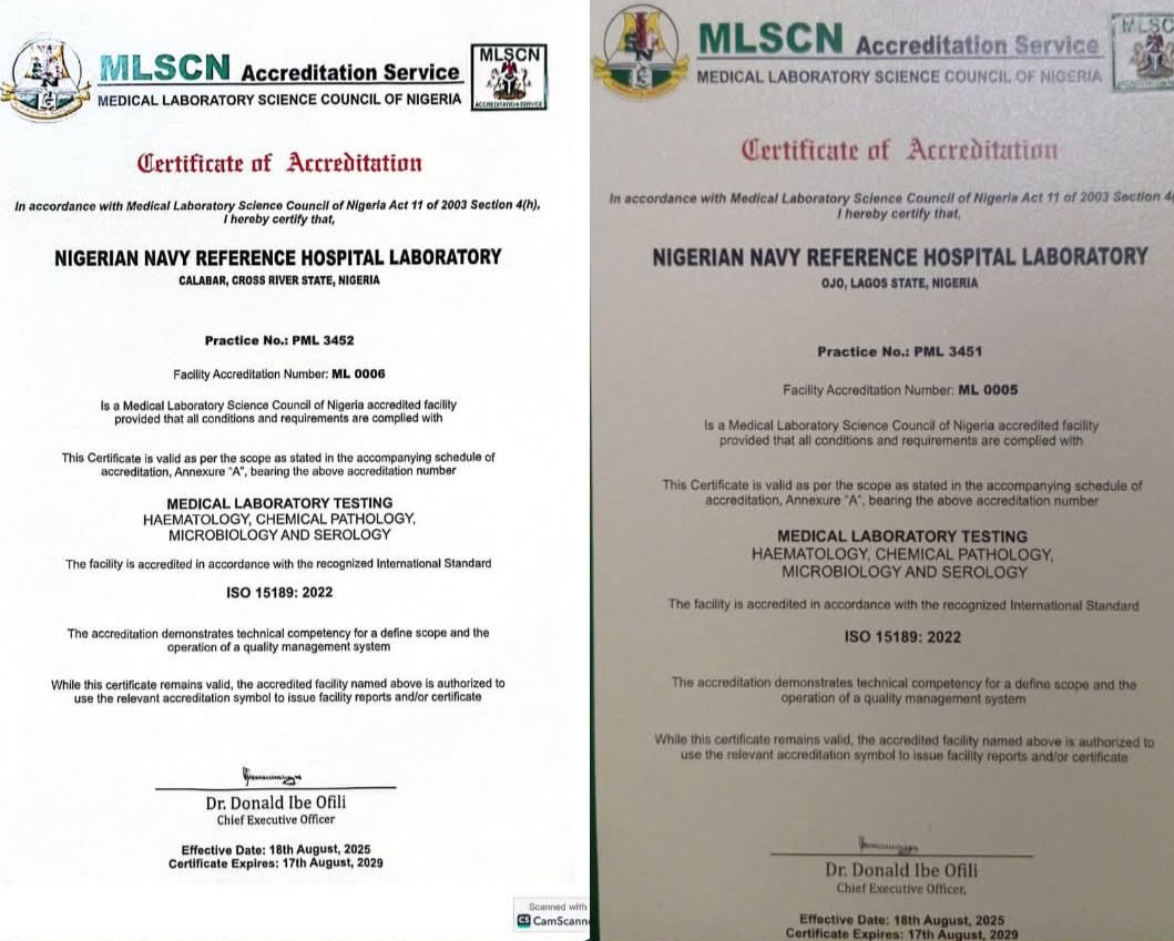 According to a statement issued by the Navy, the achievement highlighted the capability and professionalism of its medical laboratories in delivering accurate, reliable, and quality diagnostic services aligned with global best practices. The accreditation covered the Nigerian Navy Reference Hospitals (NNRH) located in Ojo, Lagos State, and Calabar, Cross River State.